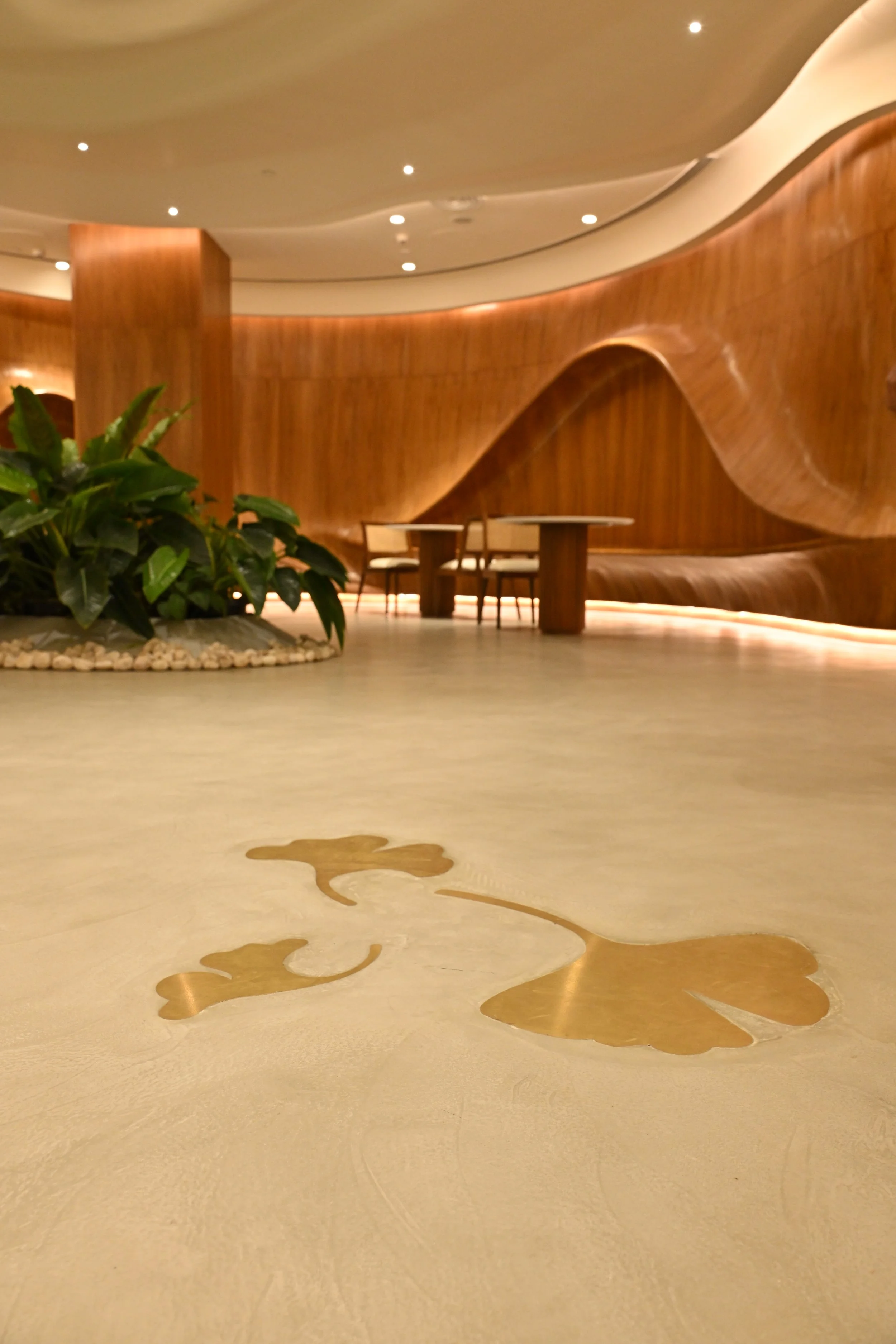 At its core, the floor is composed of micro-concrete, chosen for its muted tactility, seamless continuity, and architectural neutrality. Embedded within this plane are delicate brass inlays of ginkgo leaves, carefully scaled and positioned at different areas within the floor plan.